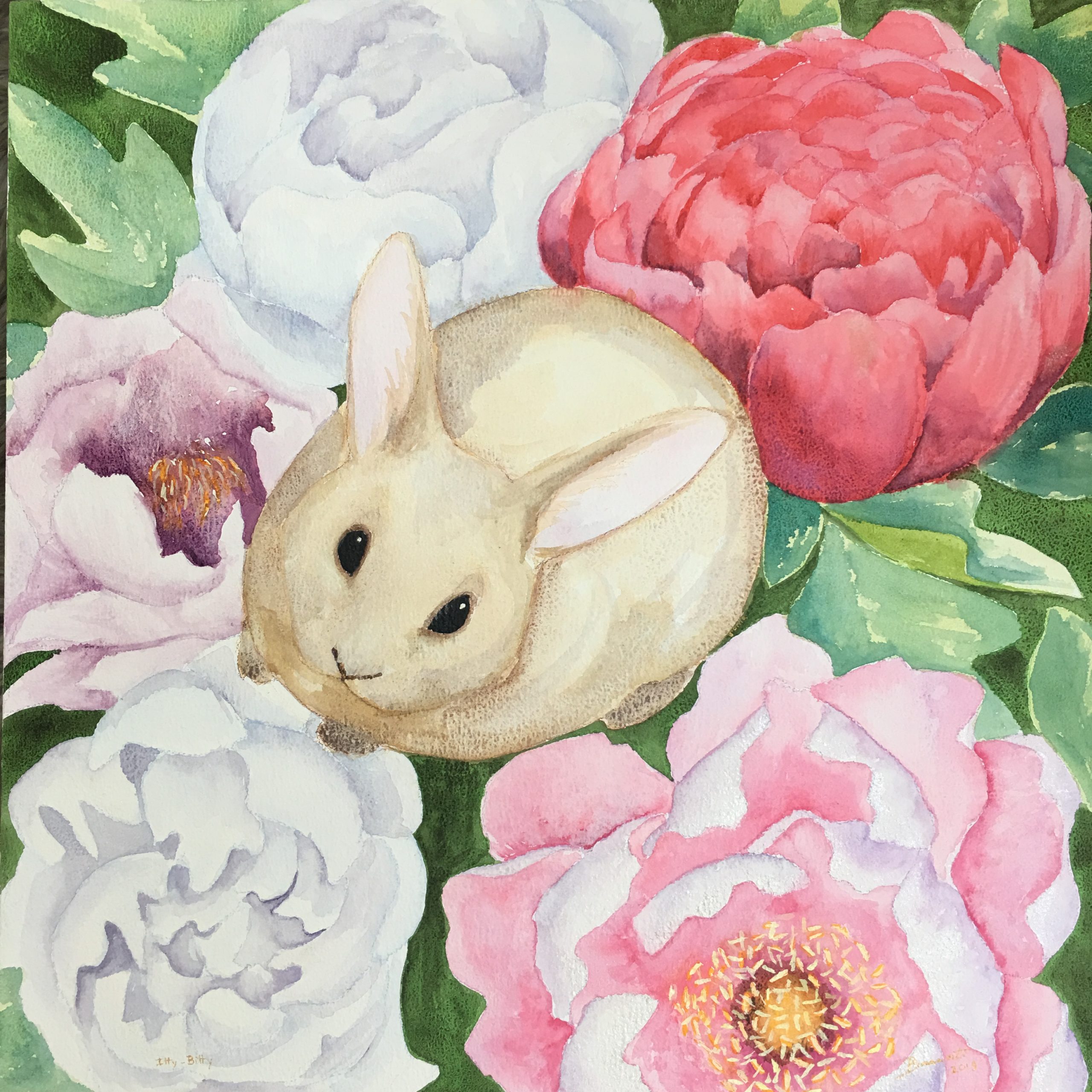 watercolor on board, watercolor, small bunny, floral, pink, cute bunny painting