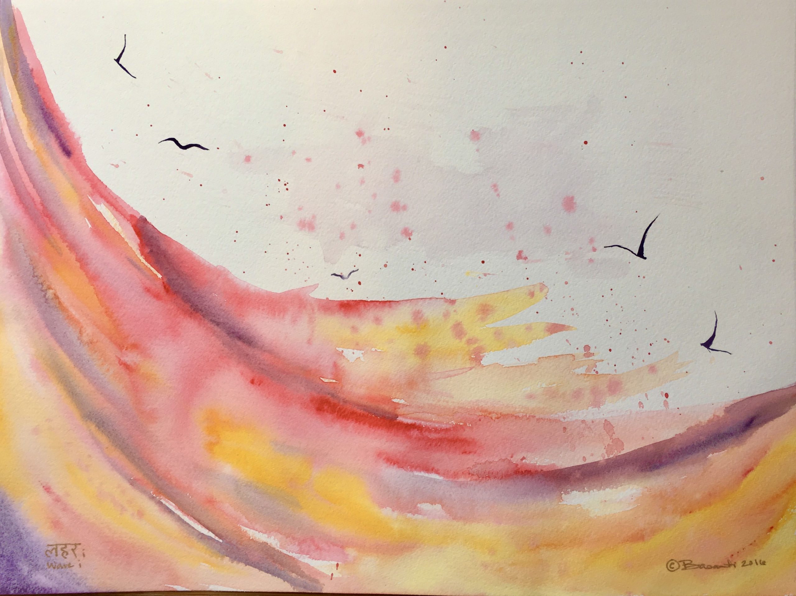 coral, yellow, pink, amethyst, wave watercolor painting, birds, ocean, abstract, water, waves